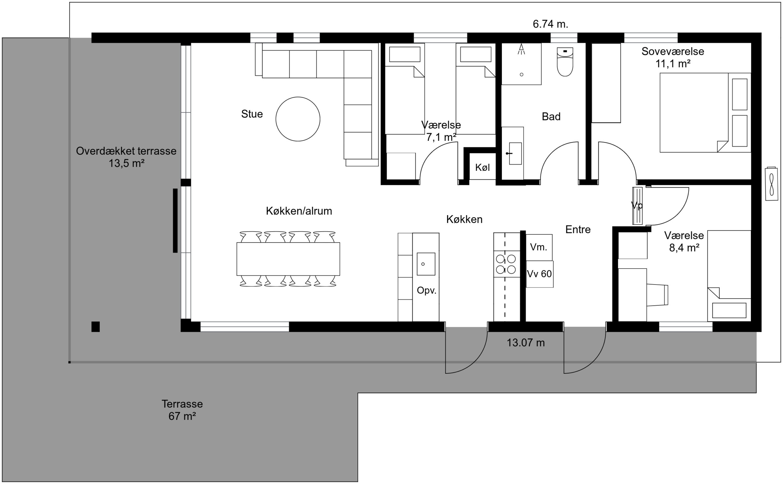 Areal: 88 m². Overdækket terrasse: 13,5 m². (Træterrasse: 67 m². er ikke inkl.)