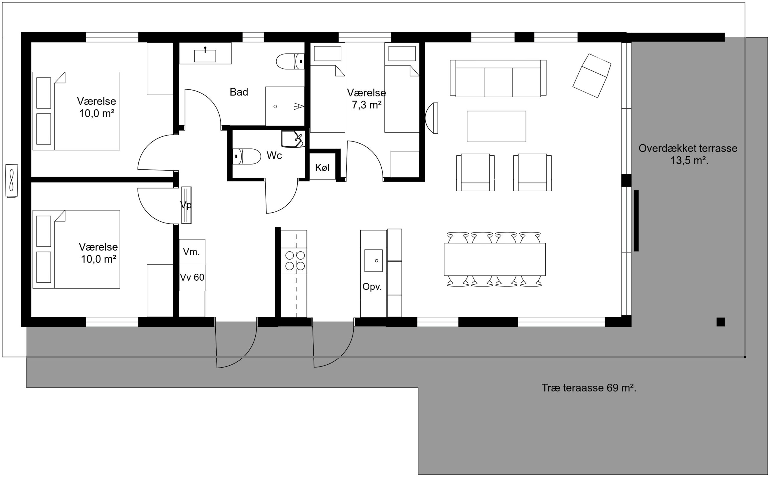 Areal: 95 m². Overdækket terrasse: 13,5 m². (Træterrasse: 69 m². er ikke inkl.)